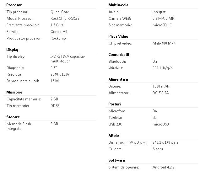 – avand la baza un procesor Cortex-A9 in patru nuclee, model RockChip RK3188, tactat la 1.3 GHz, 2 GB de RAM DDR3 si un chipset grafic Mali-400 MP4, tableta Texet TM-9768HD trebuie sa faca fata fara probleme sarcinilor multiple si redarii in format Ultra HD, Full HD 3D si chiar 4K.